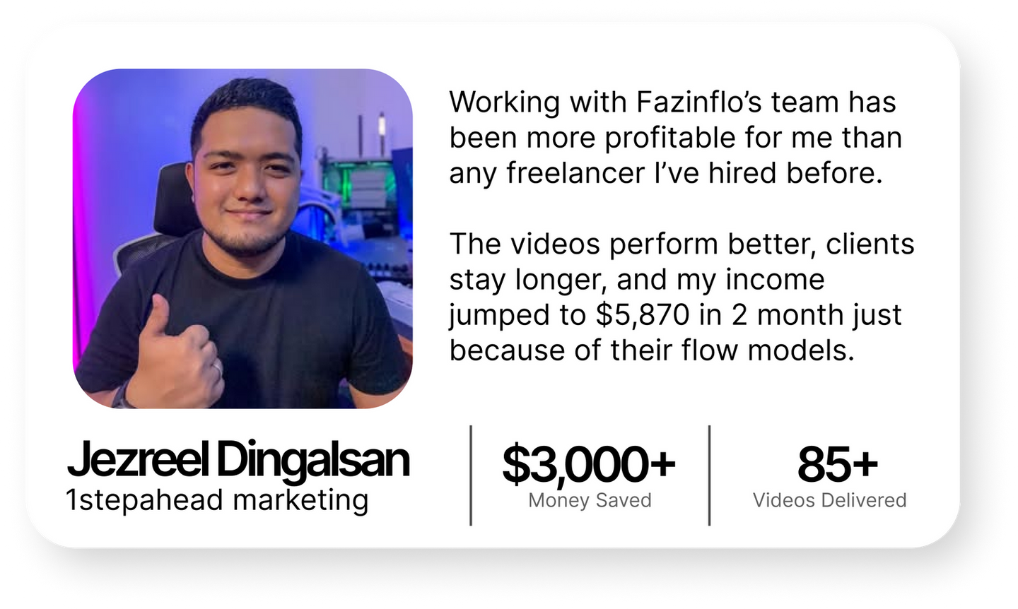 Partner up with Fazinflo to unlock instant production power without hiring, managing editors, or running operations. You bring the clients. You set the price. We execute everything in the background under your agency name.